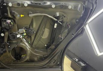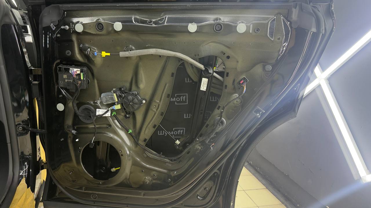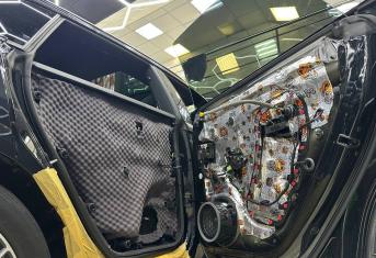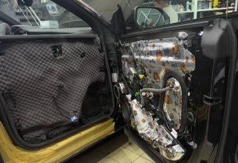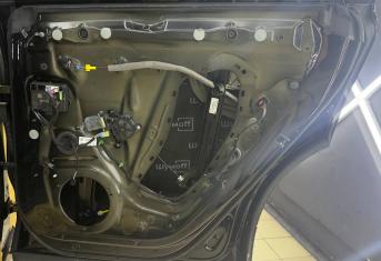 Третьим слоем применяем виброизоляцию Шумофф Jack на внутреннюю стенку двери. Проводку частично обрабатываем Шумофф Specific. Саму обшивку двери оклеиваем виброизоляцией Шумофф Jack и полностью закрываем шумопоглощающим материалом Шумофф Absorber А15. Обратите внимание, как тщательно мы обрабатываем двери виброизоляцией и шумопоглотителем - мы не экономим материал и щедро укладываем его в необходимые места. По канту обшивки двери укладываем Шумофф Absorber 5, чтобы избежать раздражительных звуков и перетирания ЛКП в местах примыкания обшивки к металлу.