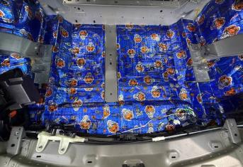 Для всей поверхности пола, от максимального подворота под торпеду до багажника включительно первым слоем применяем Шумофф Super Jack. Для задних арок в багажнике используем более легкий материал Шумофф Jack.