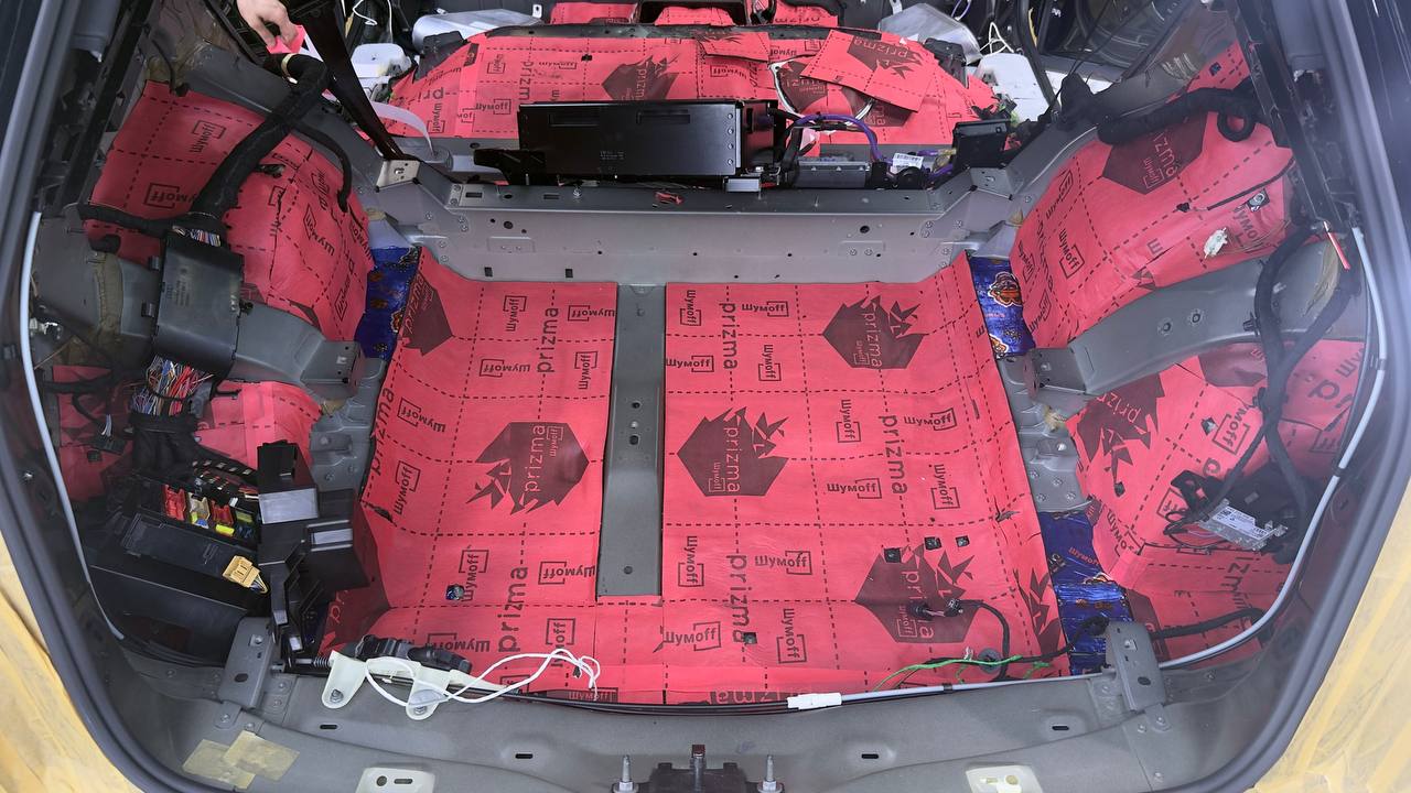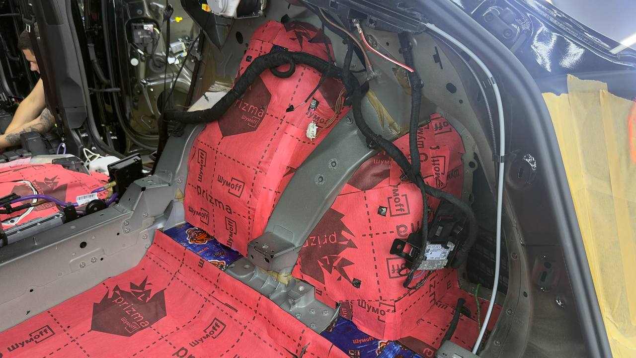 Второй слой – Шумофф Prizma шумоизолятор на основе вспененного каучука со звукоотражающей мембраной, это современный и технологичный материал который включает в себя сразу два слоя! Его мы применяем на всю плоскость пола салона и багажника в том числе и задние арки в багажнике. В задние крылья вторым слоем монтируем шумопоглотитель Шумофф Absorber А15, максимально закрывая всю плоскость крыла на сколько это позволяет конструкция автомобиля.