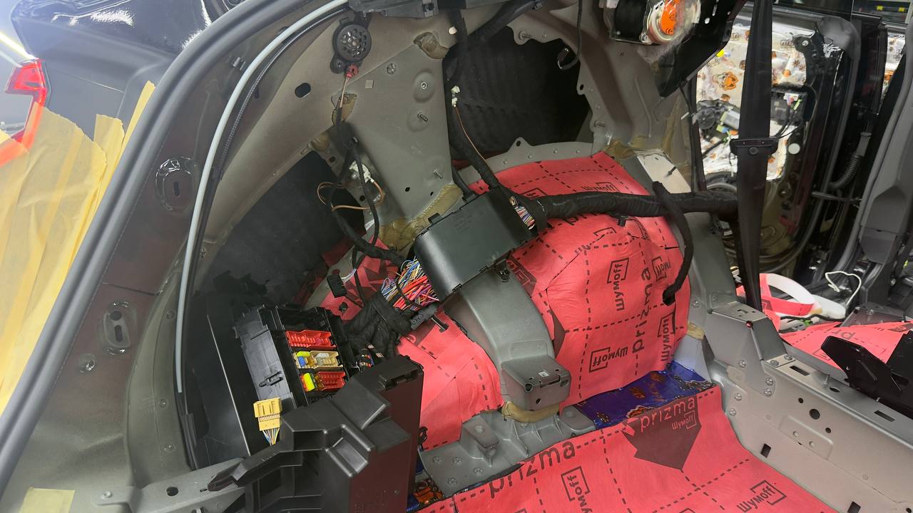 Штатная шумоизоляция в Audi Q8 уложена выборочно. Её настолько мало, что никакого эффекта он не приносит. Виброизоляция есть на полу салона и багажника, задних арках. Ниже вы можете увидеть все что скрыто под декоративными элементами салона. Перед началом работ мы в обязательном порядке проверяем заводскую шумоизоляцию на качество укладки. Плохо проклеенные участки заводской виброизоляции демонтируем. После этого обезжириваются все поверхности и мы приступаем к монтажу новых шумоизоляционных материалов.
