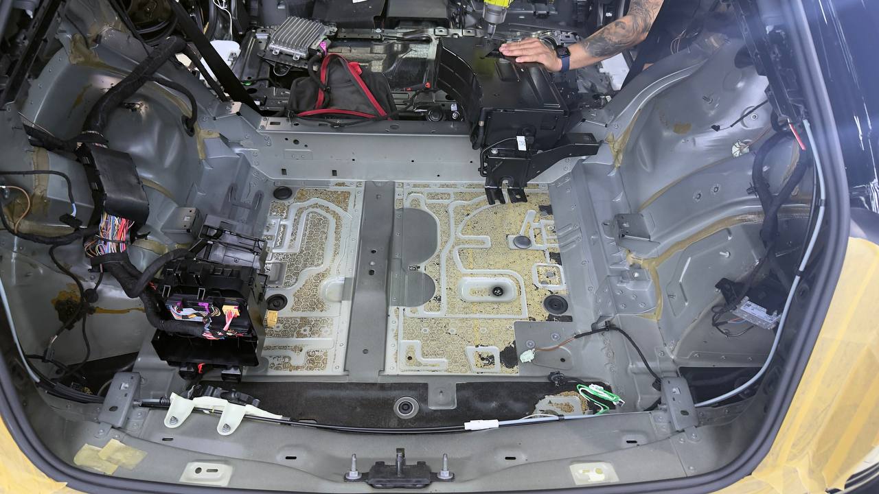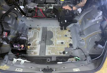 Приступаем к работам с полом, на разборку всего салона уходит около 1 часа. После чего мы подготавливаем поверхность, очистив ее от пыли и предварительно обезжирив. Штатная виброизоляция хорошо держится и её мы не демонтировали.