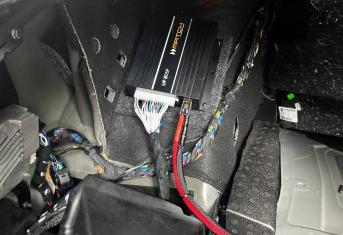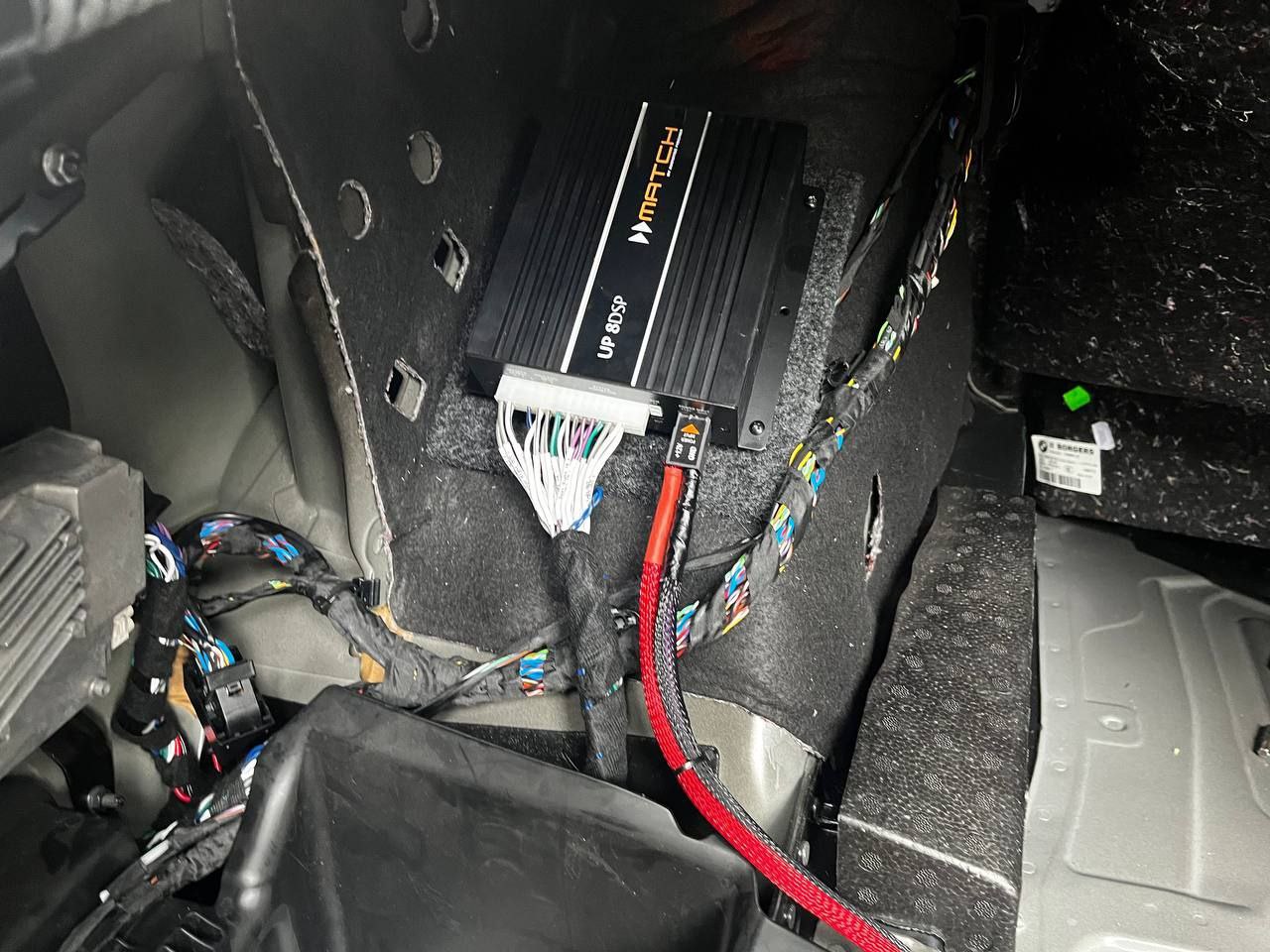 На данном автомобиле мы установили полный комплект динамиков фирмы Match: торпедо, двери, место под сидениями. А сердцем нашей системы выступает 8-ми канальный процессорный усилитель. Его смонтировали на задней арке, под декоративной обшивкой багажника. Вся аудиосистема "спрятана" по штатным местам! Силовая проводка уложена по штатным местам с применением специального адаптера изготовленного для этого автомобиля, для конкретно этой комплектации.