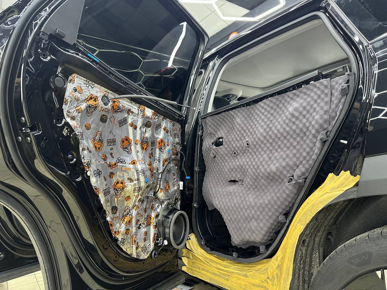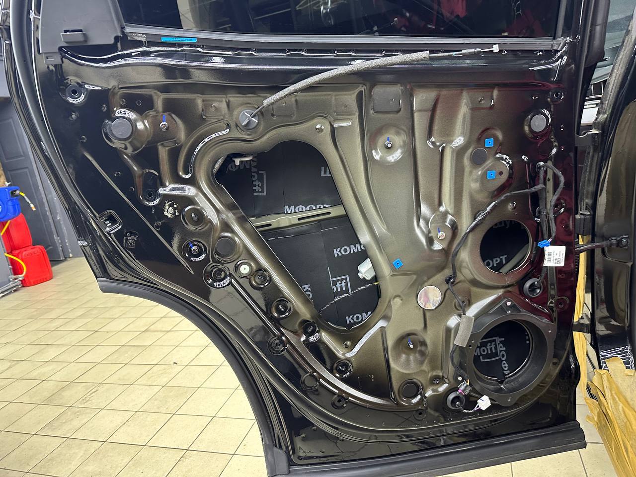 Третьим слоем применяем виброизоляцию Шумофф Jack на внутреннюю стенку двери. Проводку частично обрабатываем Шумофф Specific. Саму обшивку двери оклеиваем виброизоляцией Шумофф Jack и полностью закрываем шумопоглощающим материалом Шумофф Absorber А15. Обратите внимание, как тщательно мы обрабатываем двери виброизоляцией и шумопоглотителем - мы не экономим материал и щедро укладываем его в необходимые места. По канту обшивки двери и клипсы укладываем Шумофф Absorber 5, чтобы избежать раздражительных звуков и не портить ЛКП.