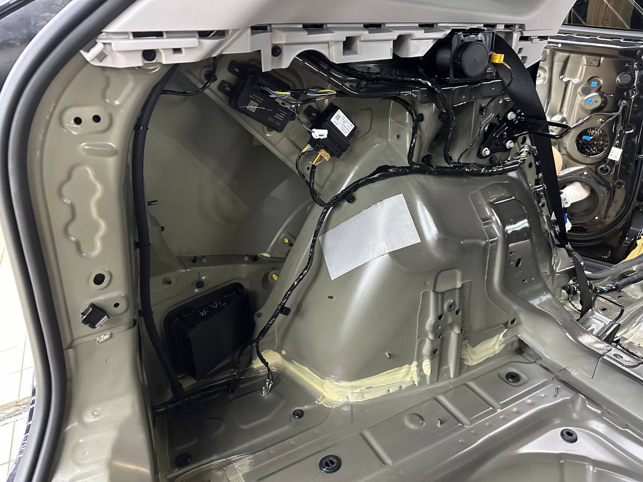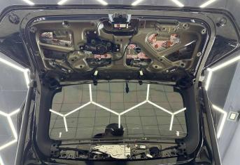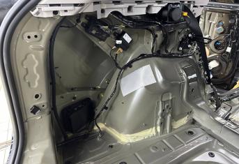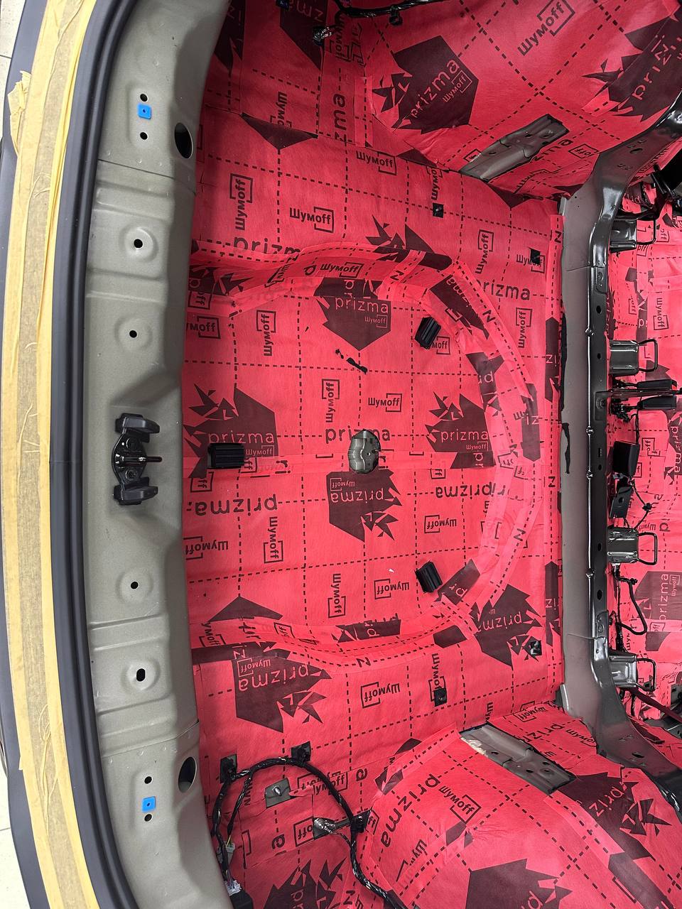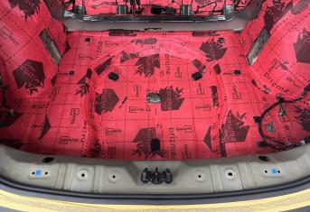 На внешний металл крышки багажника наносим виброизоляцию Шумофф Jack. На обшивку монтируем Шумофф Jack и шумопоглотитель Flex А15. Материалы подобраны по минимальному весу, дабы не создавать излишнюю нагрузку на крышку и она не закрывалась под весом материала. По канту обшивки и клипсы обрабатываем Шумофф Absorber 5. Проводку обрабатываем Шумофф Specific.