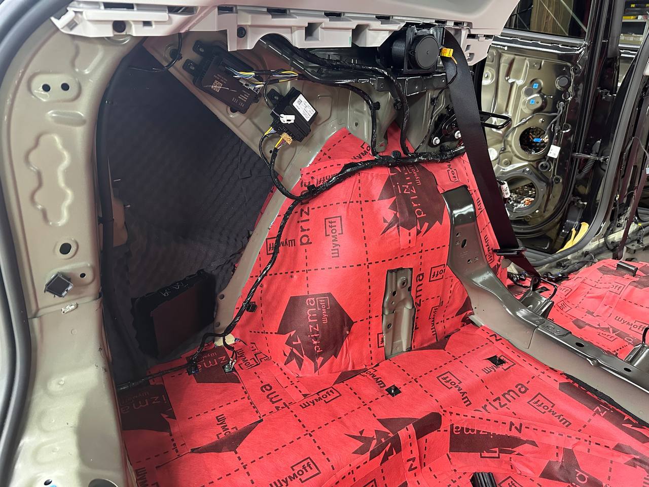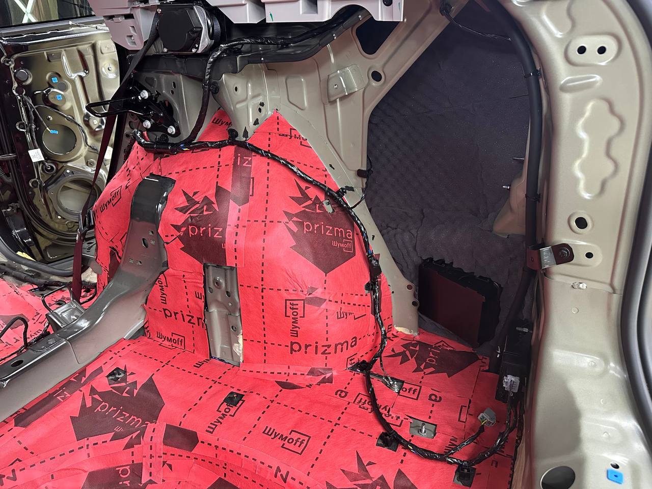 Второй слой – Шумофф Prizma шумоизолятор на основе вспененного каучука со звукоотражающей мембраной, это современный и технологичный материал который включает в себя сразу два слоя! Его мы применяем на всю плоскость пола салона и багажника в том числе и задние арки в багажнике. В задние крылья вторым слоем монтируем шумопоглотитель Шумофф Absorber А15, максимально закрывая всю плоскость крыла на сколько это позволяет конструкция автомобиля.