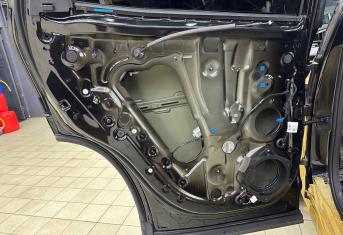 Начинаем работу с разборки дверей, подготовки поверхности и обезжириванию. Все работы по демонтажу пластика выполняются специальным инструментом. Мы гарантируем целостность клипс, креплений и отсутствие различного рода царапин, задиров на обшивках.