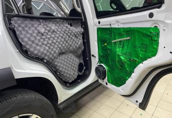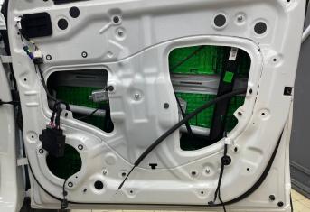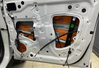 Вторую стенку двери обрабатываем Шумофф М2. Саму обшивку двери локально оклеиваем виброизоляцией Шумофф М2 для снижения резонанса пластика и полностью закрываем новым шумопоглощающим материалом Шумофф Ultimat W17. По канту обшивки двери и клипсы обрабатываем Шумофф Absorber 5, а на открытую проводку Шумофф Specific.