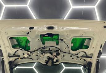 В технологические отверстия капота, на внешний металл, монтируем виброизоляцию Шумофф М2 и на штатную применяем шумо-теплоизоляцию Practik Base 4.