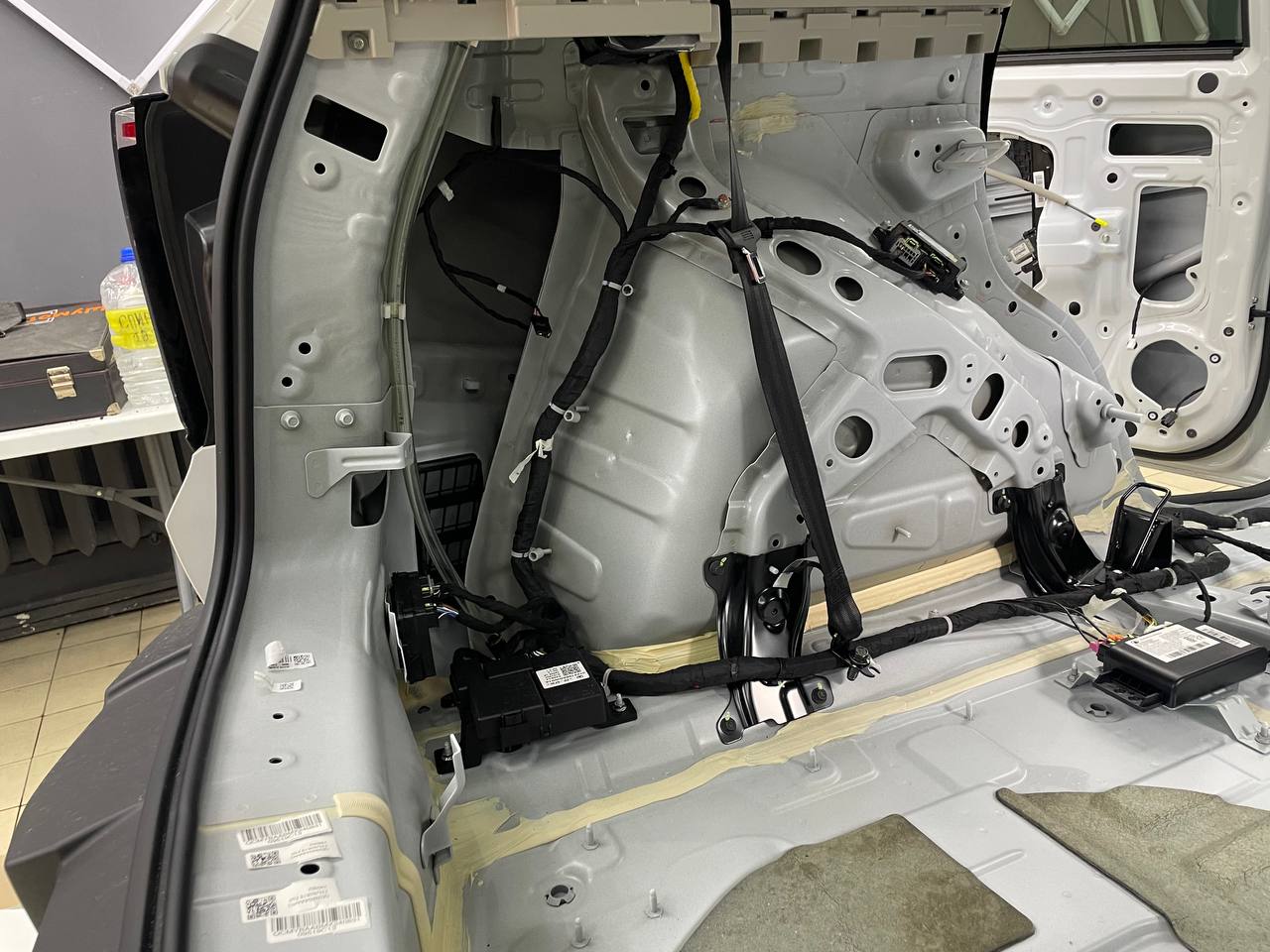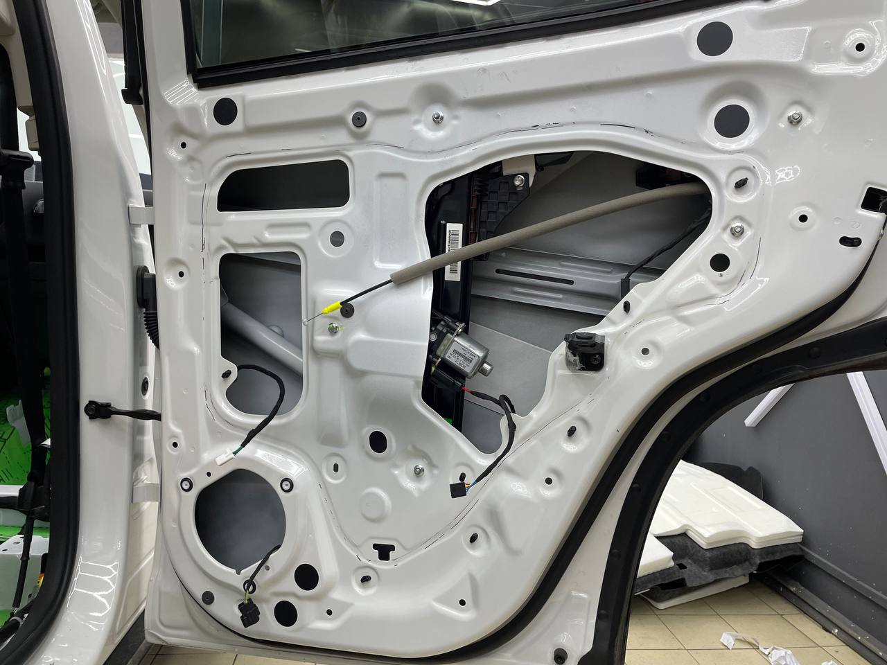 Начинаем работу с разборки дверей, подготовки поверхности и обезжириванию. Все работы по демонтажу пластика выполняются специальным инструментом. Мы гарантируем целостность клипс, креплений и отсутствие различного рода царапин, задиров на обшивках.