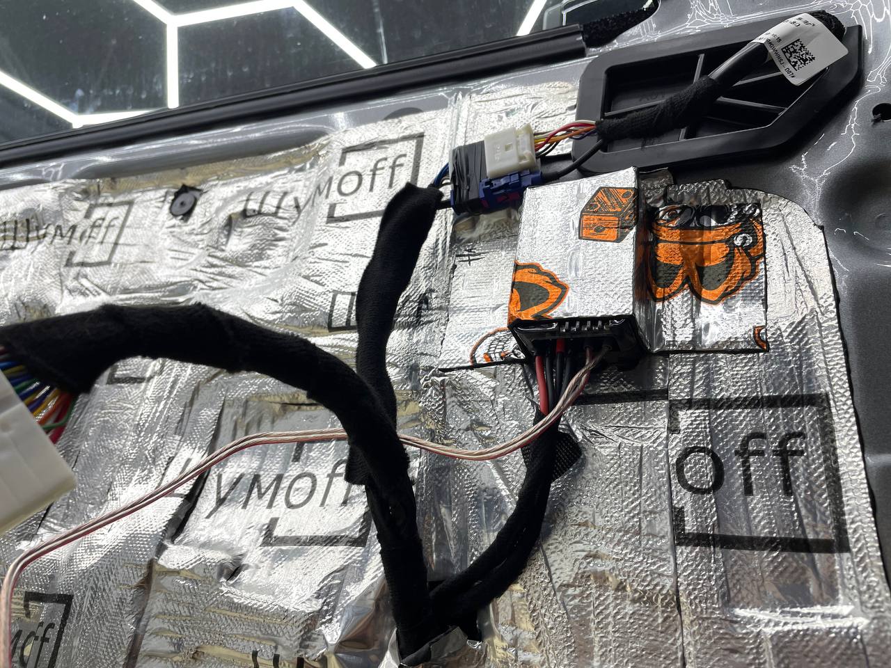 На фото ниже вы можете увидеть дополнительную шумоизоляцию на дверях, которая выполнена в 5 слоёв по нашей авторской технологии. 2 слоя нанесены на внешнюю стенку двери, один на внутреннюю и 2 слоя на дверных картах. В продаже есть готовые комплекты для дверей, а способ установки описан в подробном отчете по комплексной шумоизоляции Хавейл Джолион.