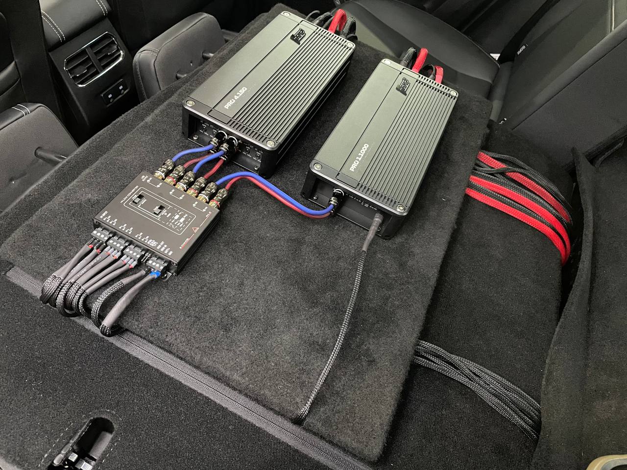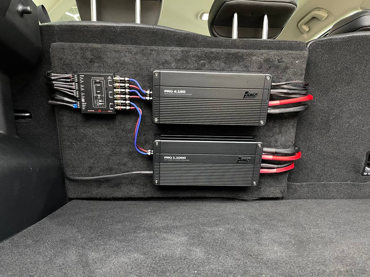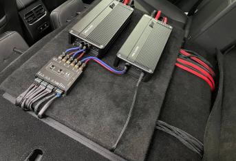 На данном автомобиле мы установили 4-х канальный усилитель и моноблок от AMP. Для того чтобы сохранить штатное головное устройство и запустить систему от него, мы применили 6-ти преобразователь линейного сигнала.