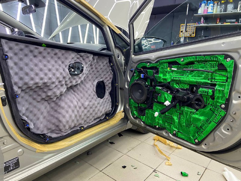 Вторую стенку двери обрабатываем Шумофф М2. Саму обшивку двери локально оклеиваем виброизоляцией Шумофф М2 для снижения резонанса пластика и полностью закрываем новым шумопоглощающим материалом от компании Шумофф, это Ultimat W17. По канту обшивки двери укладываем Шумофф Absorber 5, а на открытую проводку Шумофф Specific.