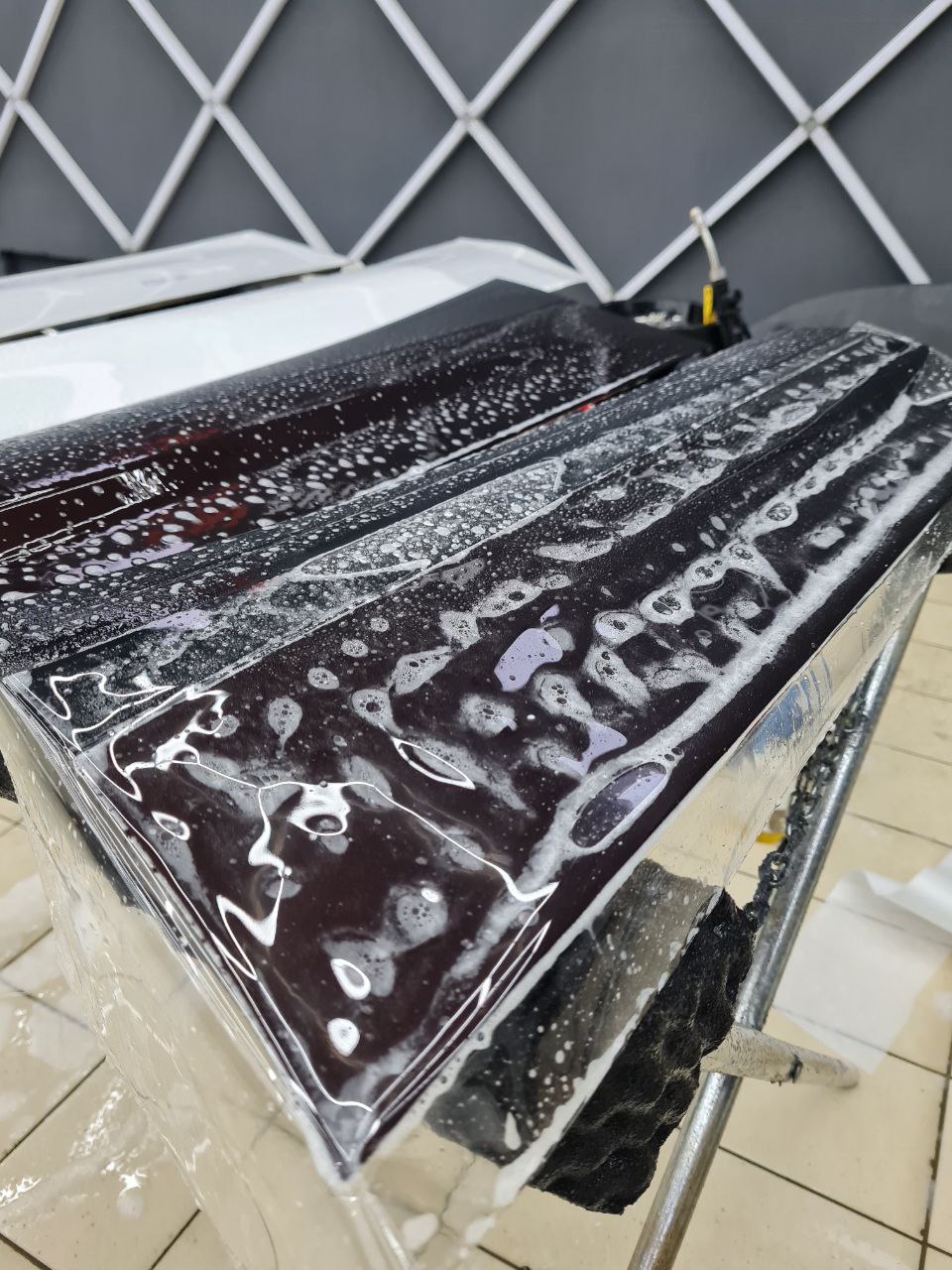 Далее не о процессе, а о конечном результате который получается на данном авто. Автомобиль будет меньше пачкаться, пленка обладает высоким гидрофобным эффектом и грязь не будет задерживаться на кузове. Ну и самое главное это защита, каждый оклеенный элемент выполнен с подворотом пленки по периметру. Сколы и царапины больше не угрожают ЛКП данного автомобиля, и если вдруг произойдет неприятная ситуация с мелким ДТП к примеру во дворе, с большей долей вероятности этот вопрос решиться заменой пленки на отдельном элементе. Так же автомобиль обрел на долго гарантированный блеск, так как пленка имеет самозаживляющий эффект и мелкие риски и царапинки будут затягиваться под воздействием температуры.
