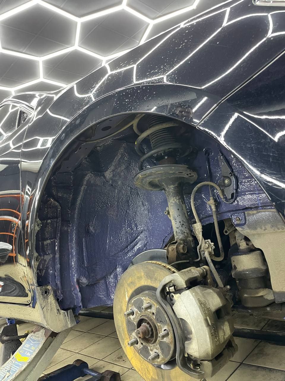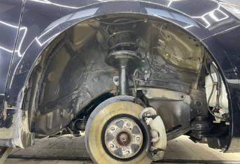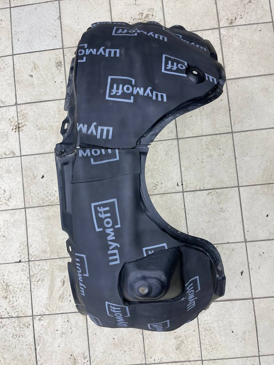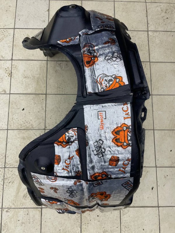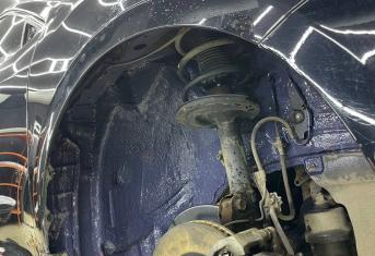 Передние подкрылки пластиковые, на них мы монтируем локально виброизоляцию Шумофф Jack и шумоизолятор Шумофф Комфорт 6. После монтажа материалов на подкрылок и кузов автомобиля заливаем жидким полимером, тем самым герметизируем швы и защищаем шумоизоляционные материалы от механических повреждений. После полного высыхания полимер обретает высокую прочность.