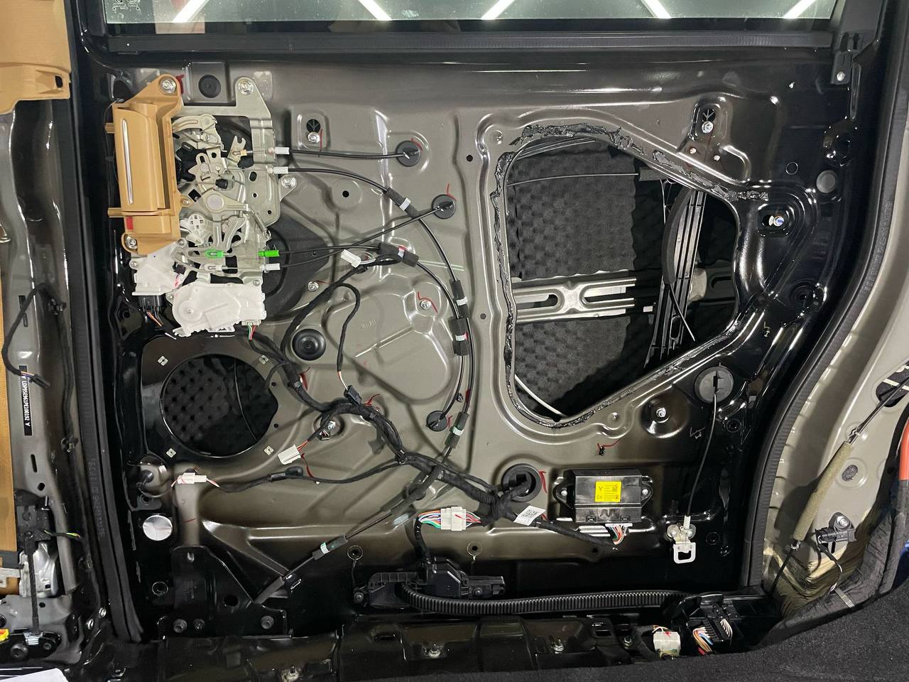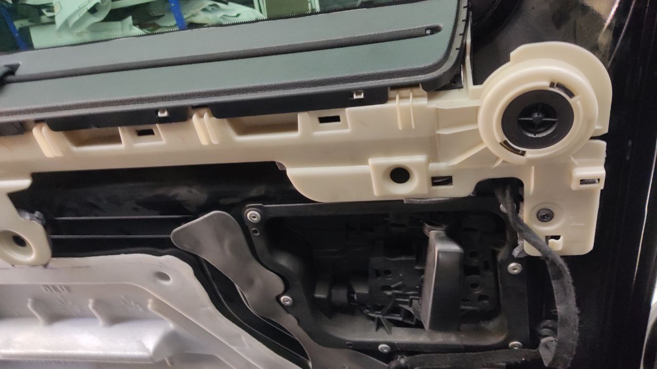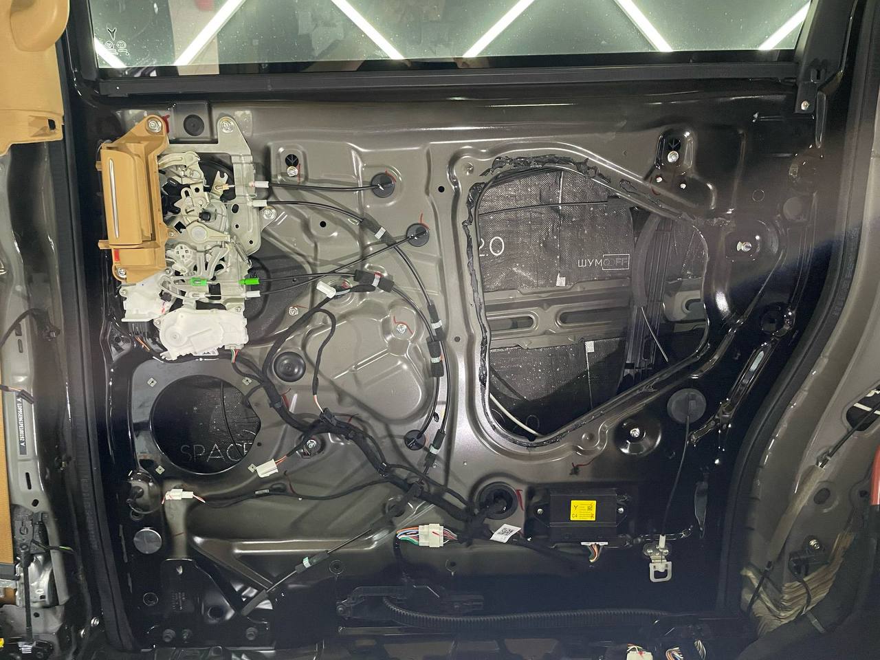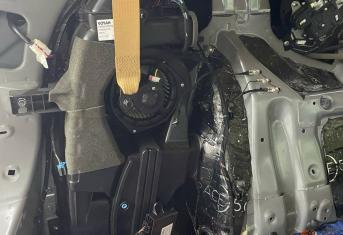 Всю проводку на двери обрабатываем уплотнительным материалом Шумофф Specific. Саму обшивку двери оклеиваем локально виброизоляцией Шумофф Space 2.0 и полностью закрываем шумопоглощающим материалом Шумофф Герметон А15. Проводку на двери обрабатываем Шумофф Specific. По канту обшивки двери и на клипсы обрабатываем уплотнителем Шумофф Absorber 5, чтобы избежать раздражительных звуков и не портить лакокрасочное покрытие.