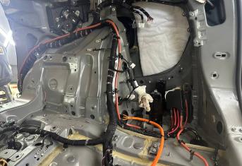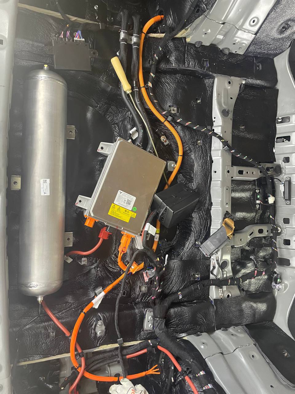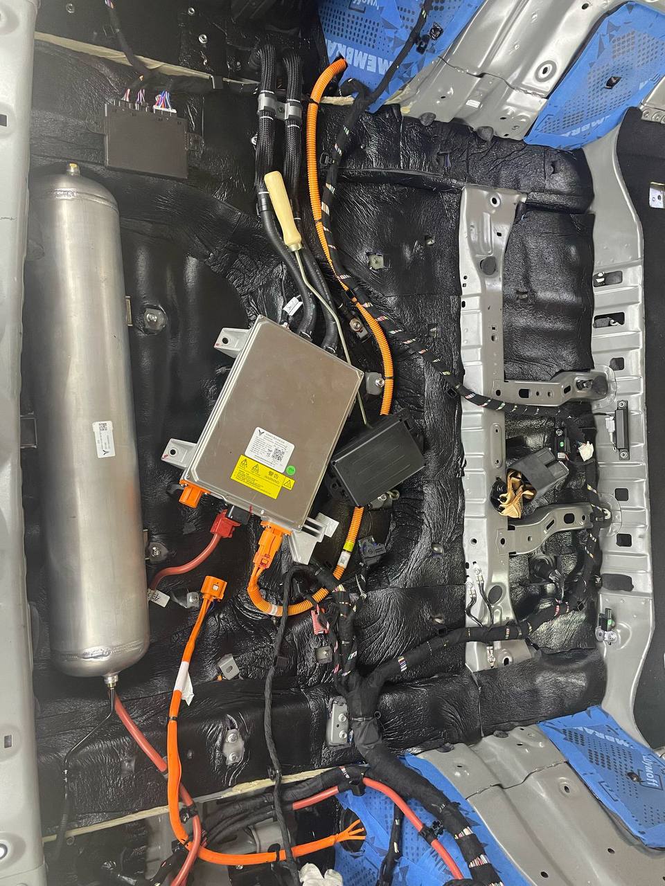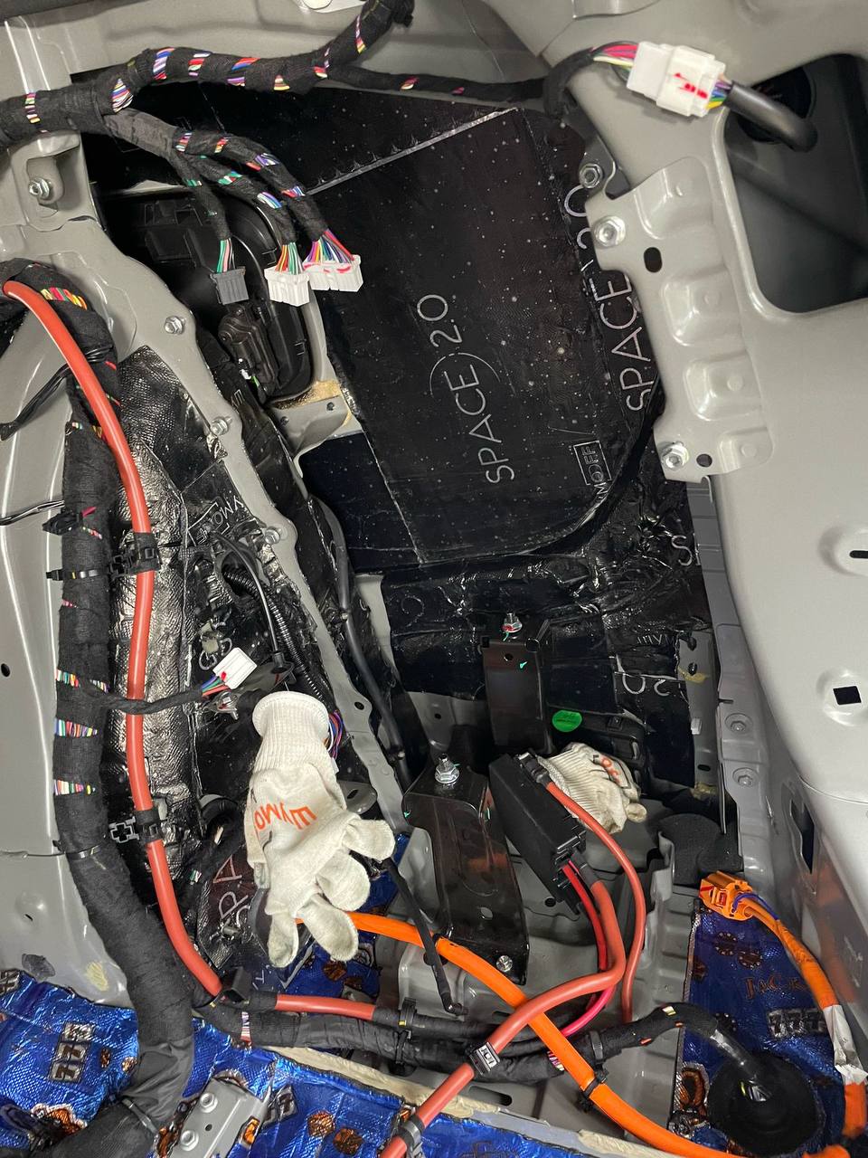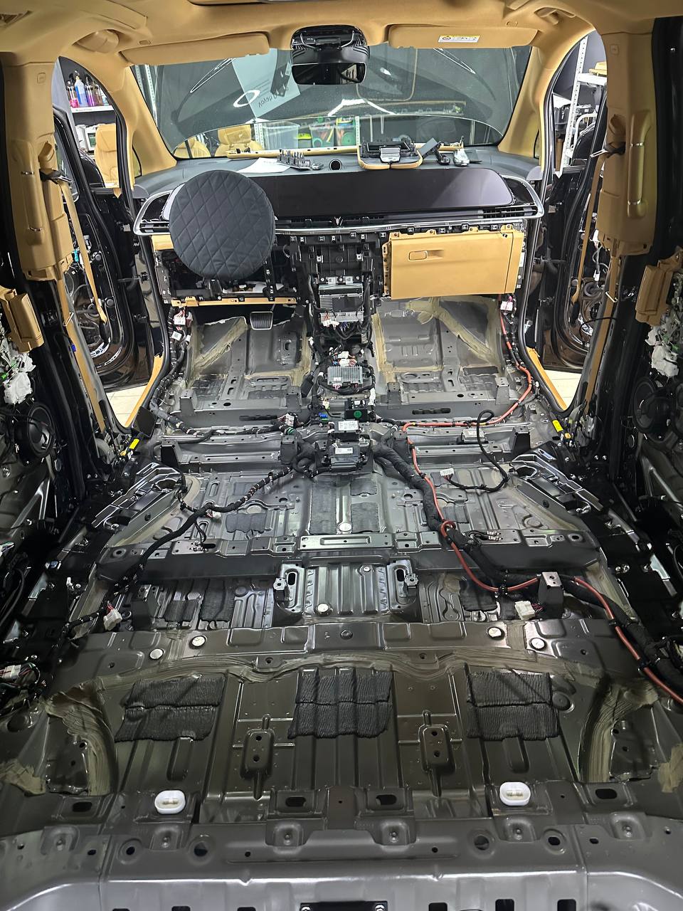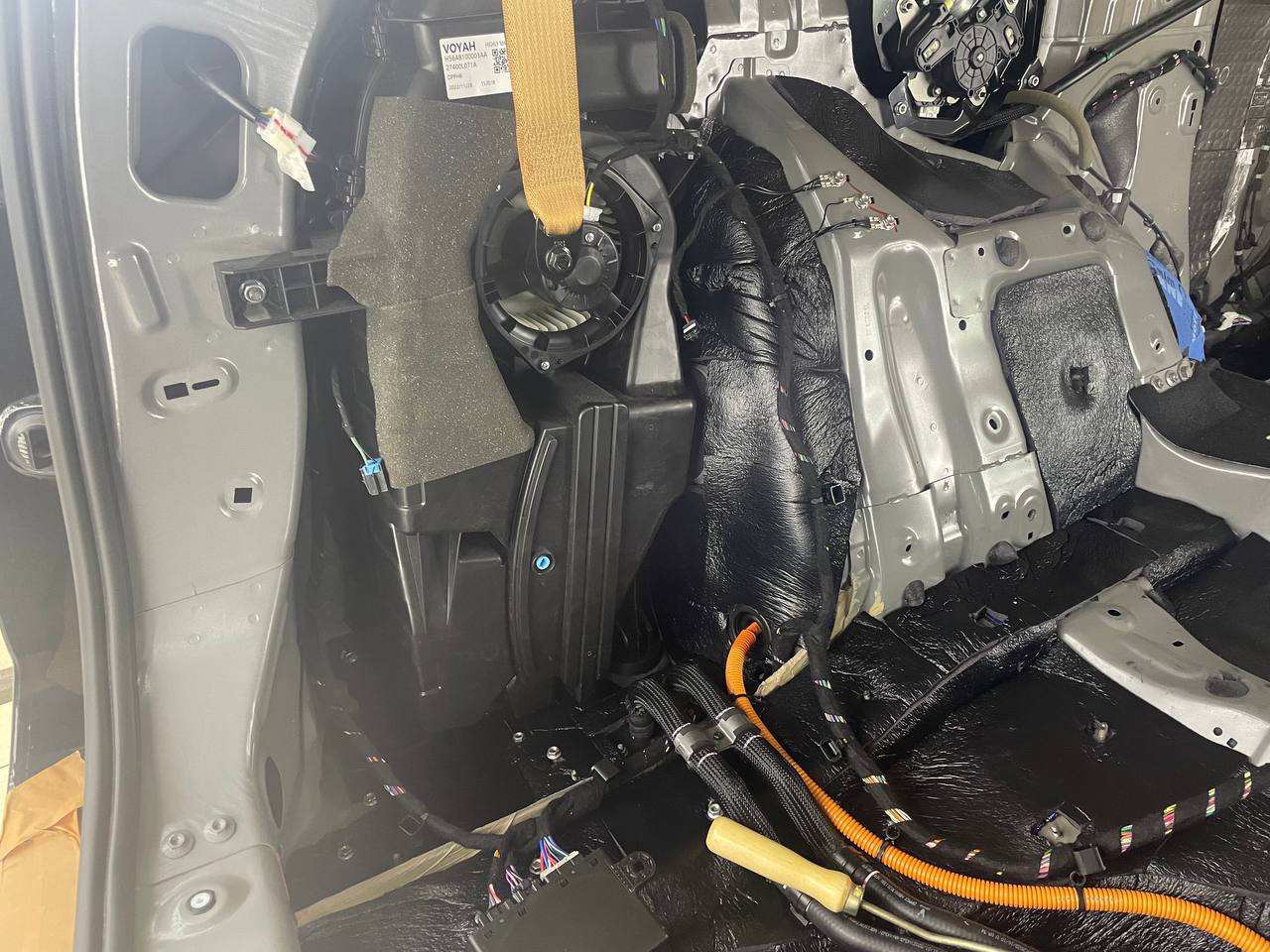 Штатная шумоизоляция в Voyah Dream уложена выборочно. Её настолько мало, что никакого эффекта он не приносит. Виброизоляция есть на полу салона и багажника. Ниже вы можете увидеть все что скрыто под декоративными элементами салона. Перед началом работ мы в обязательном порядке проверяем заводскую шумоизоляцию на качество укладки. Плохо проклеенные участки заводской вибры демонтируем. После этого обезжириваются все поверхности и мы приступаем к монтажу новых шумоизоляционных материалов.